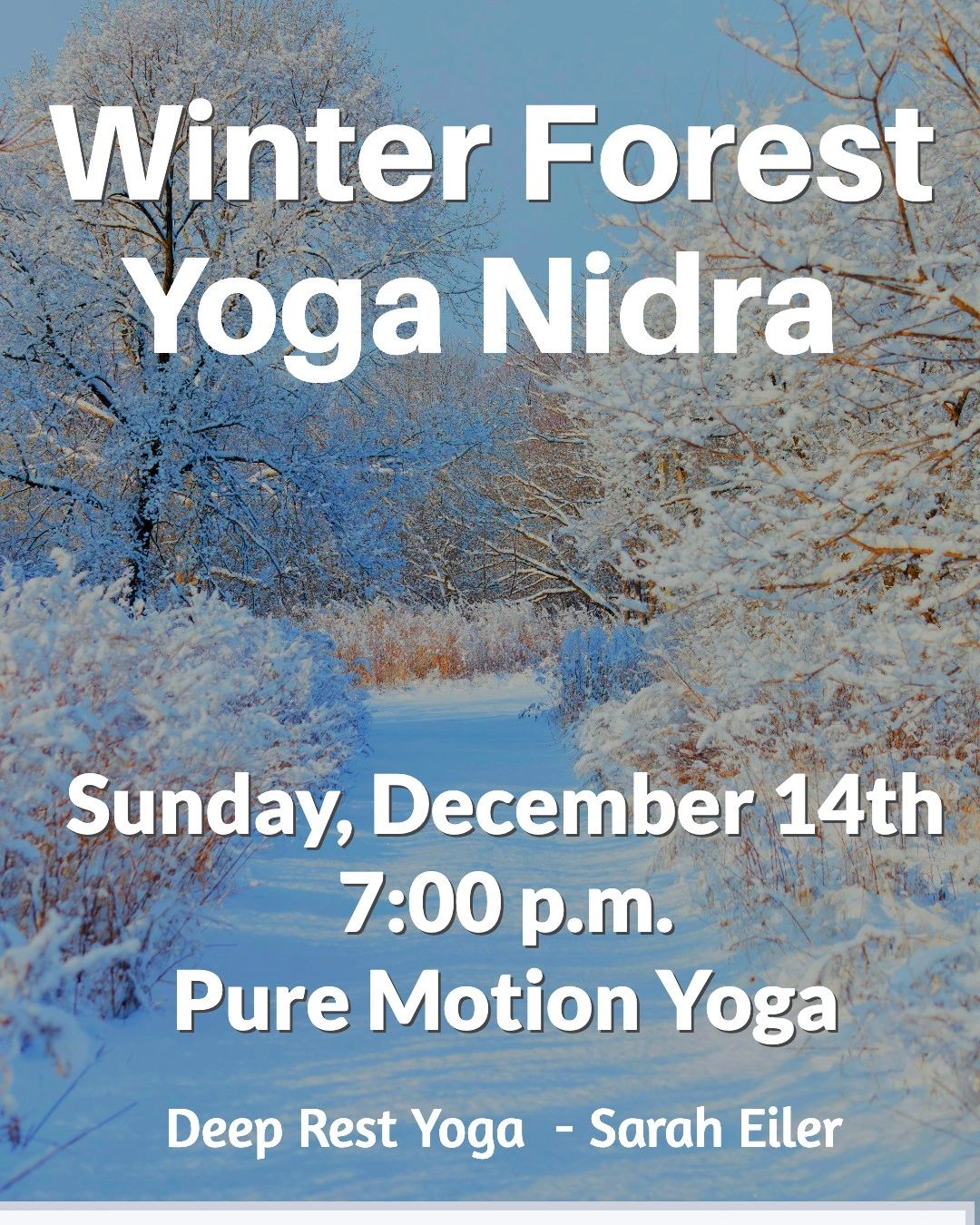 Join me this Sunday, Dec 14 at 7pm at Pure Motion Yoga for my last offering of the year. Winter Forest Yoga Nidra includes a visualization of walking through a quiet, snow-covered forest.