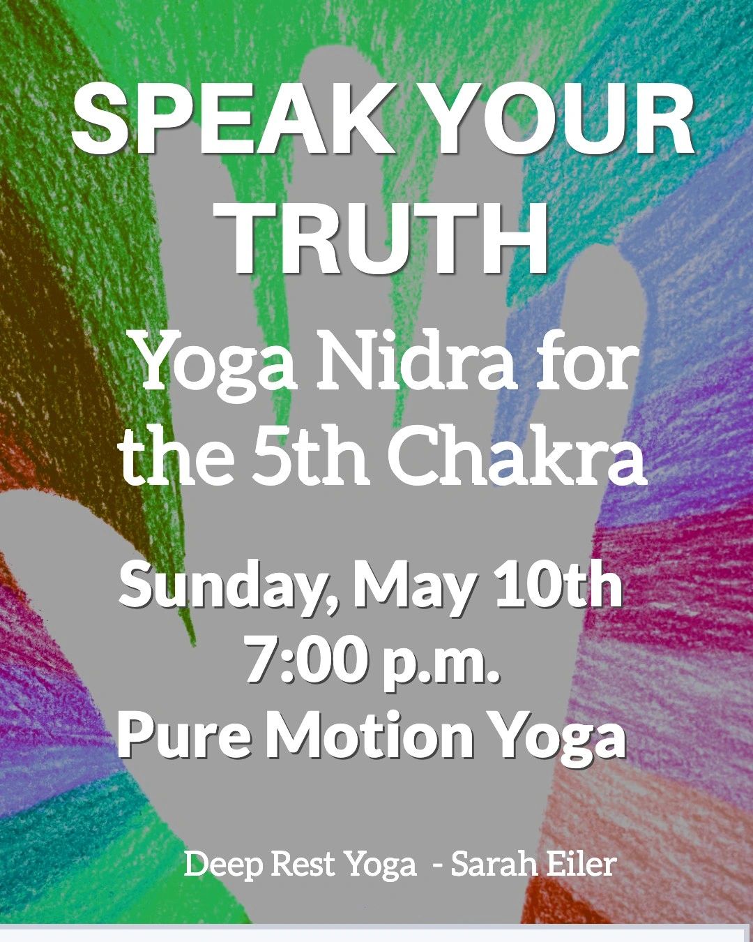 Join me on Mothers' Day, May 10th, at Pure Motion Yoga for my next live class. This year, I'm journeying through the chakras and teaching a different chakra- themed class each month. This month we will continue with the fifth chakra to speak your truth and communicate authentically.